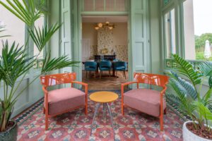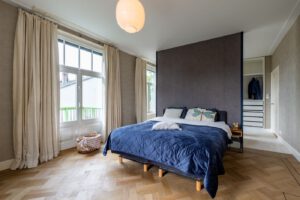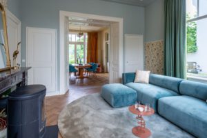 Een cadeautje om een monument als dit in te mogen inrichten. Doordat de eigenaar van het pand, de woning graag gemeubileerd wil verhuren is ons gevraagd om de woning te renoveren en op te knappen waar nodig, maar ook om de woning opnieuw te decoreren en te stylen. Vooral de woonkamer, eetkamer en tuinkamer hebben een behoorlijke metamorfose ondergaan. Door een lambrisering aan te brengen met het fantastische vogelbehang in combinatie met het prachtige kleurenpallet van Farrow and Ball, past het geheel in de tijdsgeest van toen, maar dan met een moderne benadering. Qua meubilair is het een combinatie van tweedehands design en nieuw. Het was nog een uitdaging om het Jugendstil ornament voor de voorkamer te vinden, maar gelukkig bestaan er verzamelaars van oude mallen, die deze voor ons kon maken. Voor mij was het belangrijk, dat het huis geen toonzaal zou worden, maar een gezellige woning voor een gezin of echtpaar. Dit is tot dusver prima gelukt!